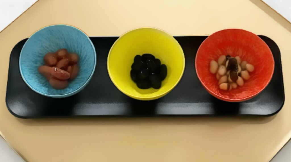茶色のおまめさんなら青色でも黄色でも赤色の器でも大丈夫になったのが嬉しい。